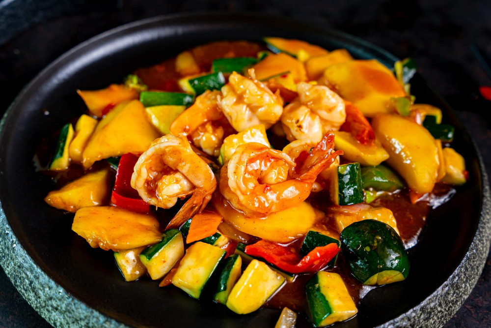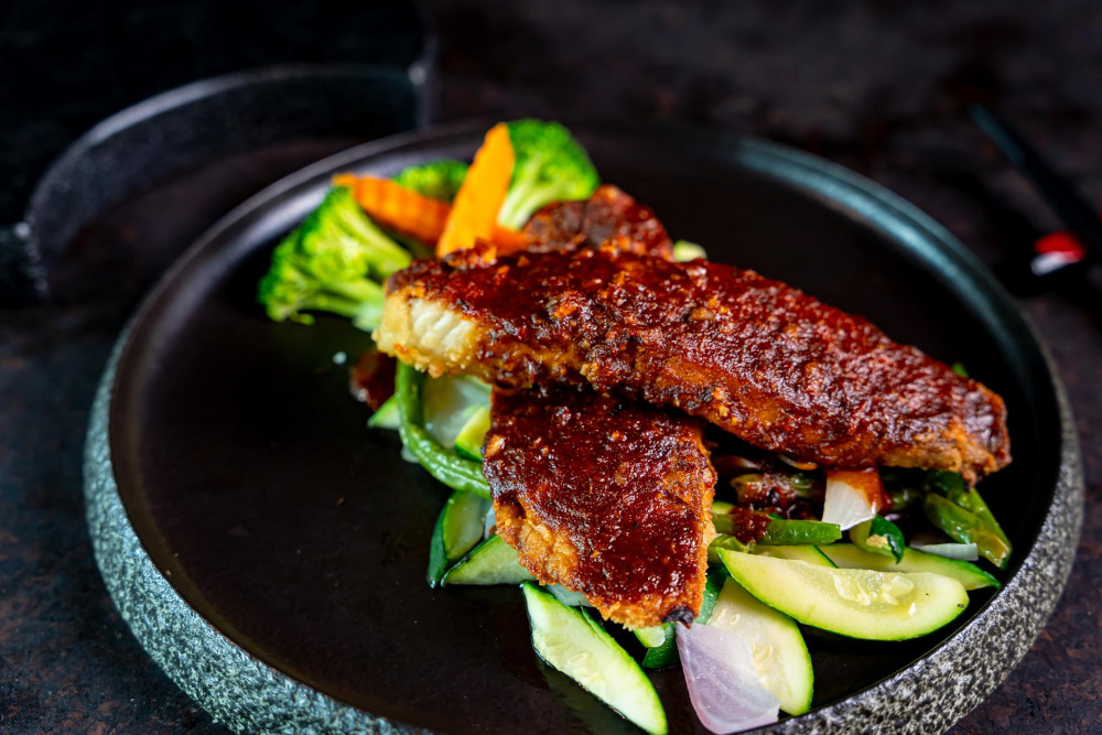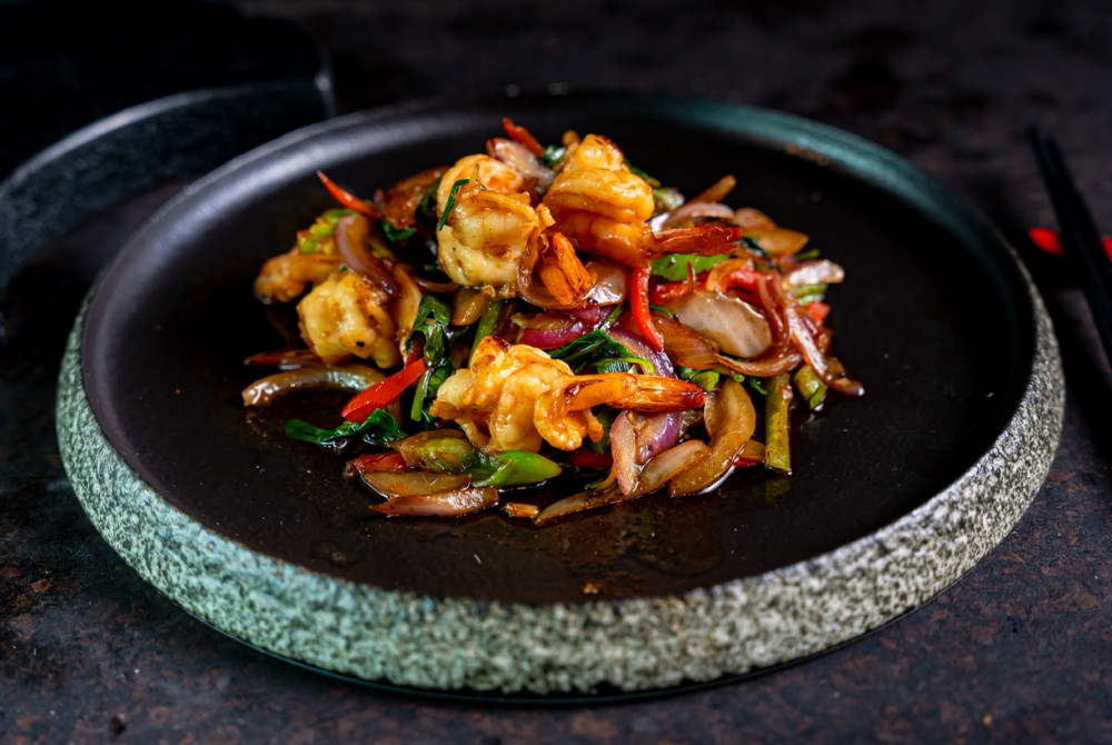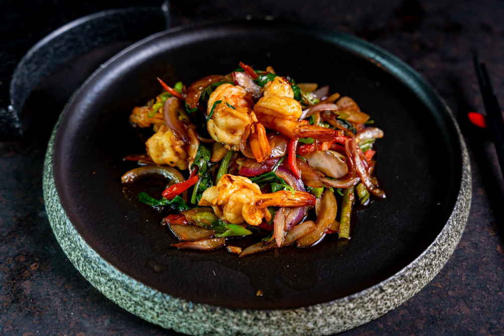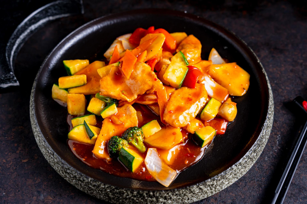 Thai style with onion red pepper basil leaves in spicy sweet sauce