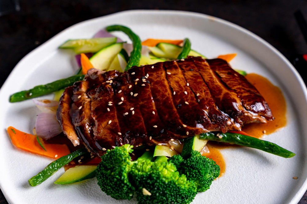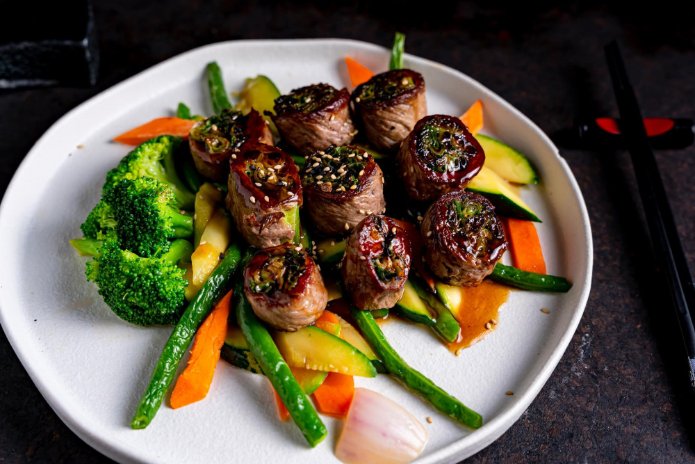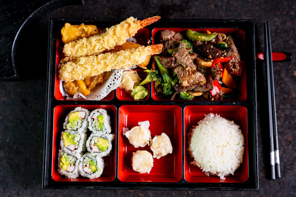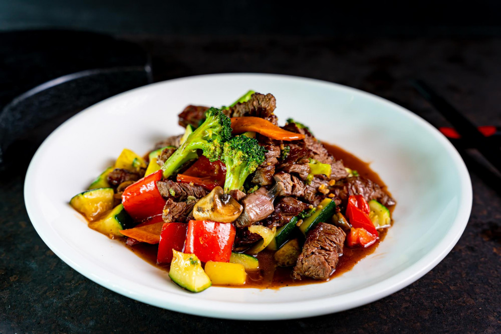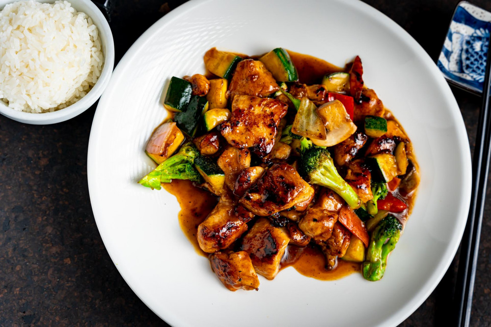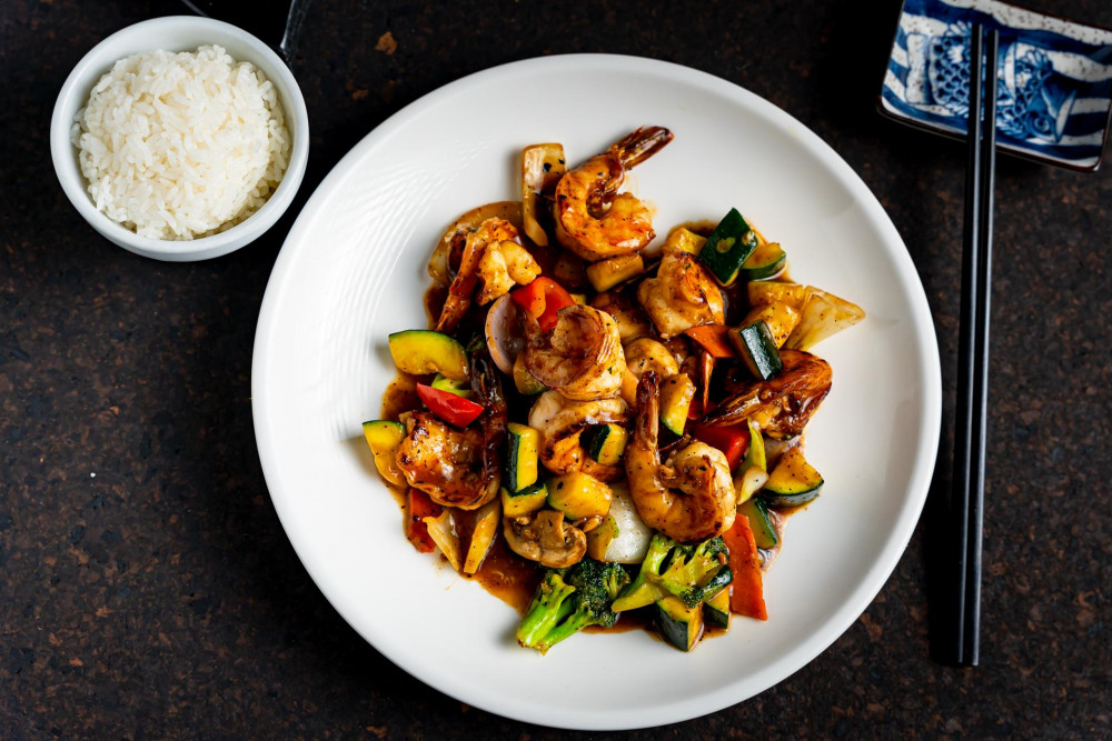 Sautéed main ingredients include: zucchini, broccoli, carrot, onion, mushroom & pepper with homemade Hibachi sauce