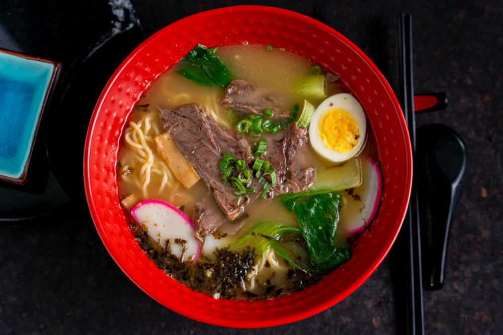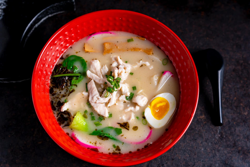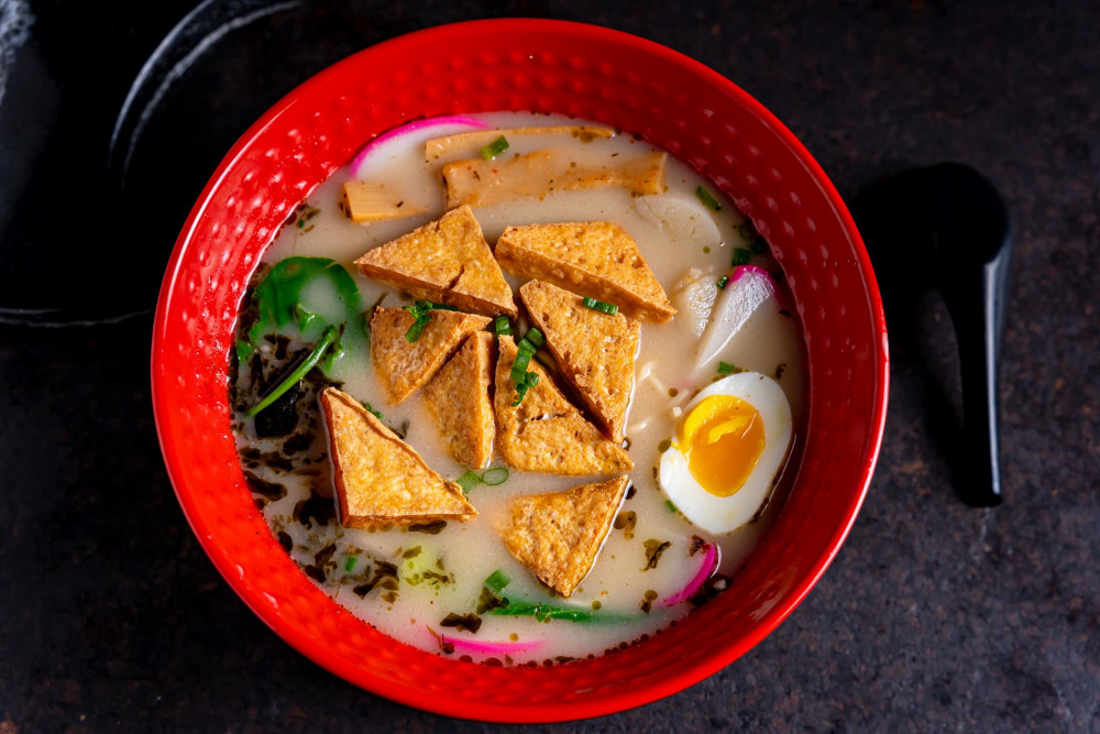 w. broiled egg, fish cake & vegetables in soup