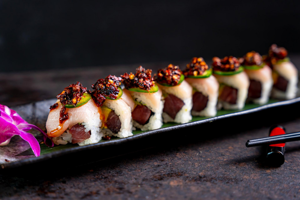 Toro avocado inside, top w. yellowtail toro jalapeno, authentic old grandma sauce