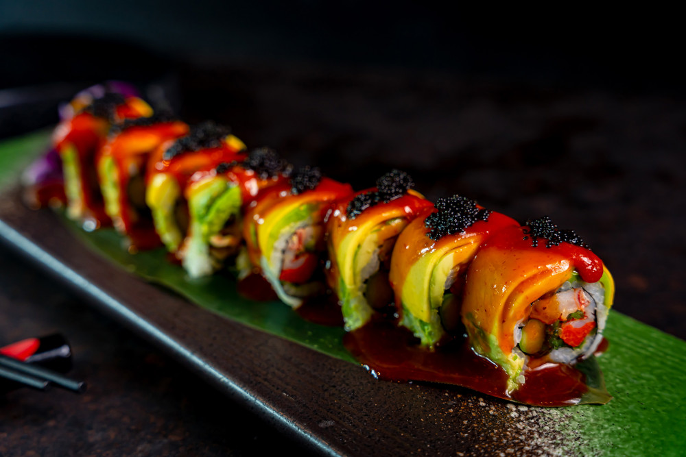 Lobster meat, asparagus, cucumber, seaweed salad, top w. mayo, avocado, chili sauce & tobiko