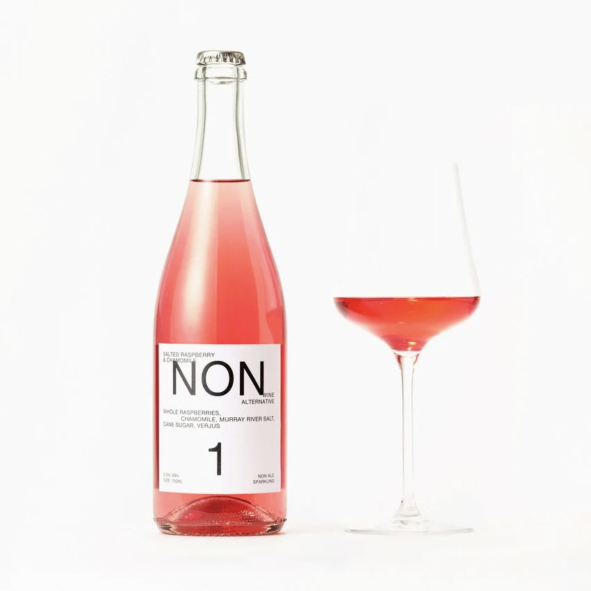 Non-Alcoholic wine made with verjus, whole raspberries, chamomile flowers, and Murray River Salt for a balanced sweet and salty flavor profile.