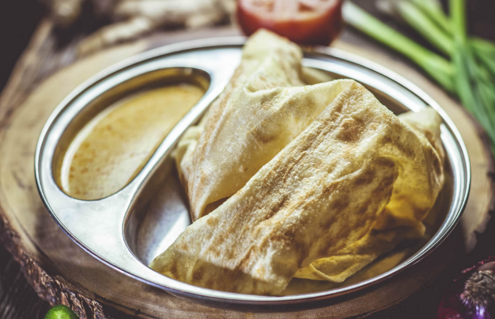 Fresh handmade flipped Indian pancake with spicy curry dip. Roti Sauce is vegan , Roti contain butter.
