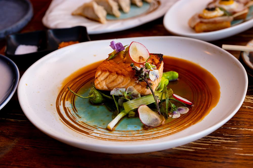 Grilled salmon, shishito pepper, mushroom, soy lime truffle sauce