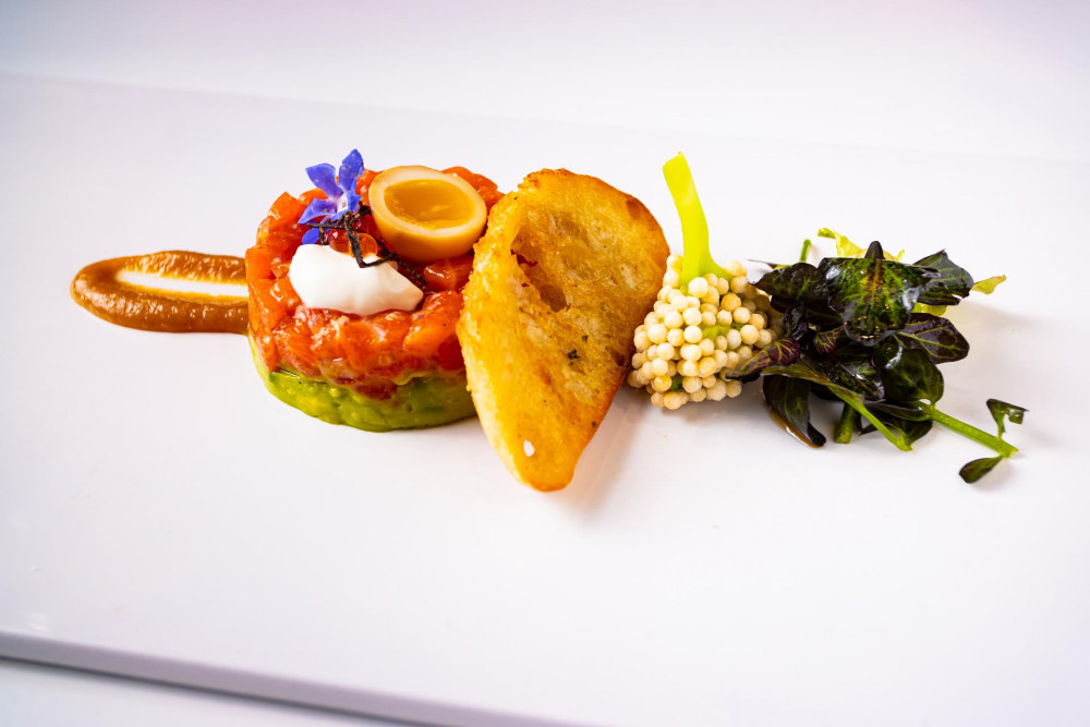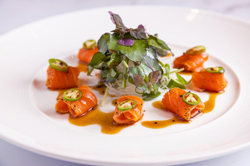ginger miso marinated salmon, ikura, crème fraiche, shio konbu yuzu vinaigrette