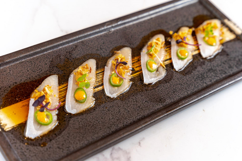 thinly sliced hamachi, jalapeno slice, yuzu soy vinaigrette