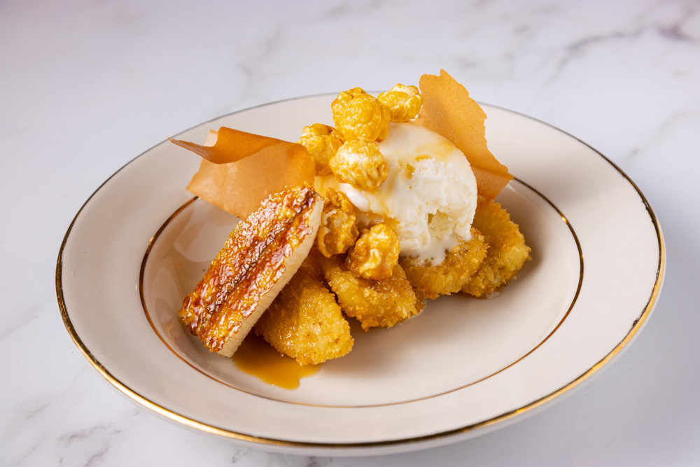panko crusted with caramel sauce, banana brulee, vanilla ice cream