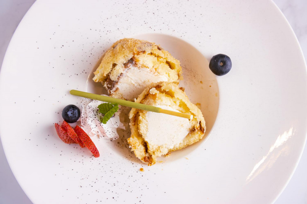 vanilla or green tea lightly fried ice cream wrapped with butter pound loaf chantilly cream, chocolate sauce