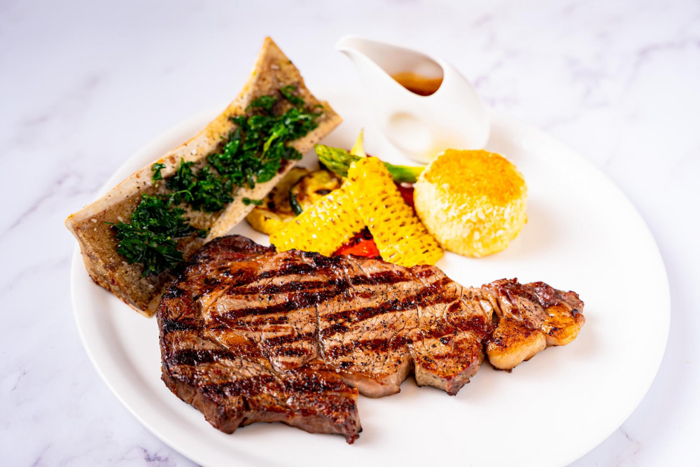 30 days dry aged, port wine reduction, potato pave bone marrow (supplement $9)