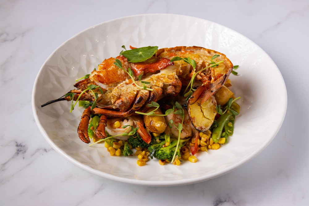 lemon butter poach shrimp & broiled whole 6oz lobster tail with sweet corn, sugar snap pea