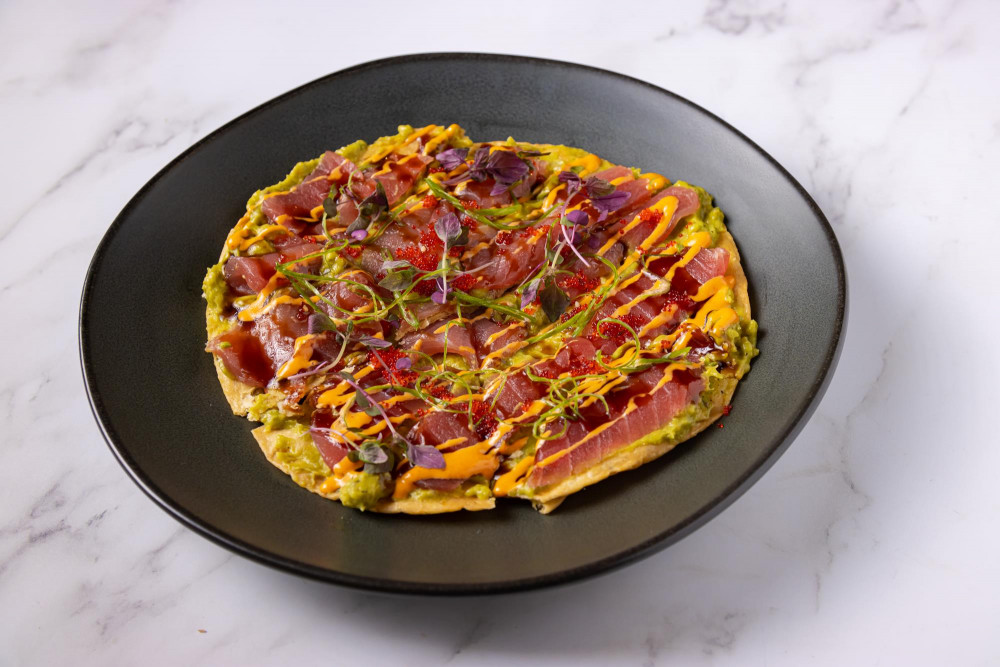 scallion pancake, sour cream, spicy aioli & kabayaki sauce, tobiko