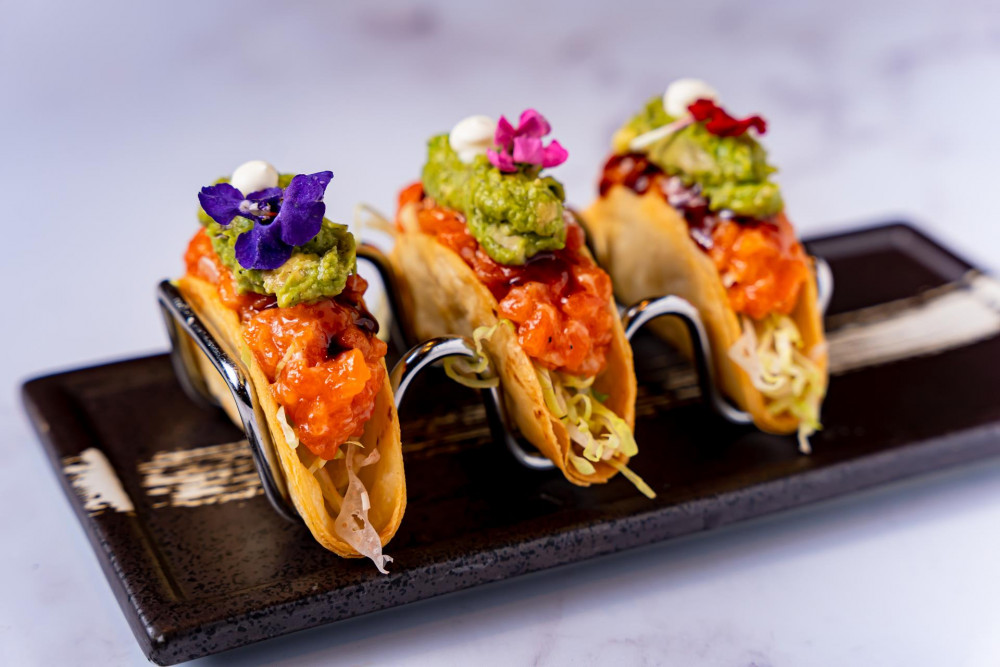 ginger miso marinated salmon, ikura, crème fraiche, avocado, shio konbu yuzu vinaigrette