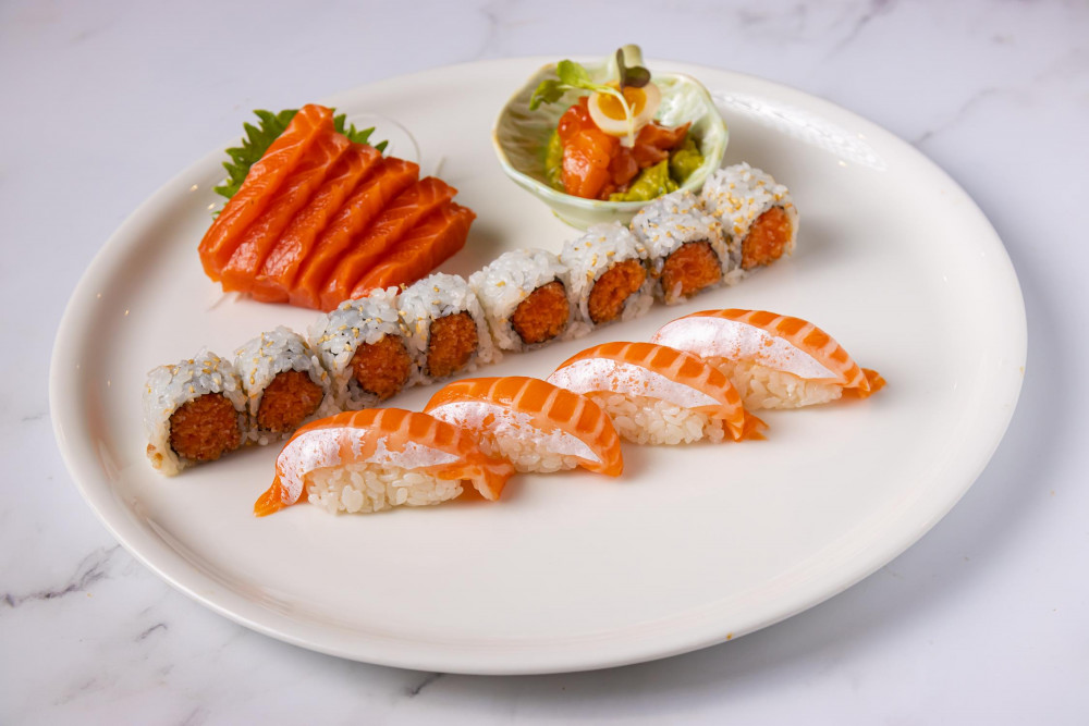 6 sashimi, 4 sushi & spicy salmon roll, salmon tartare