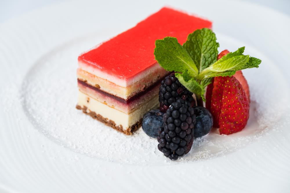 Vanilla biscuit, raspberry coulis, white chocolate mousse, and a crunchy hazelnut parline, topped with raspberry glaze