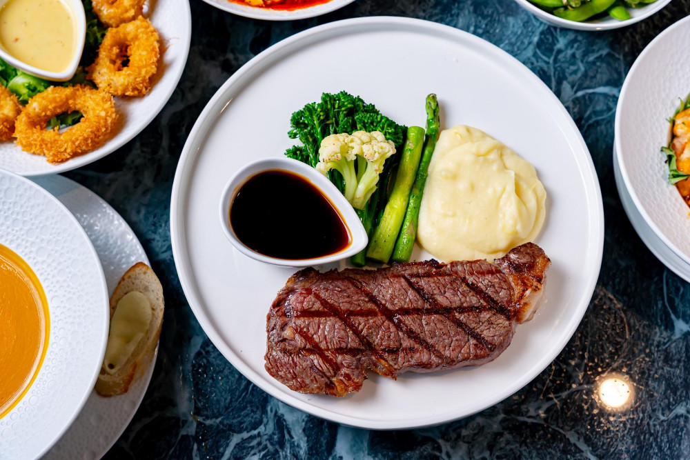 Ribeye Steak, Half Marinated Egg, Corn, Bamboo Shoots, Scallion, Sliced Kikurage