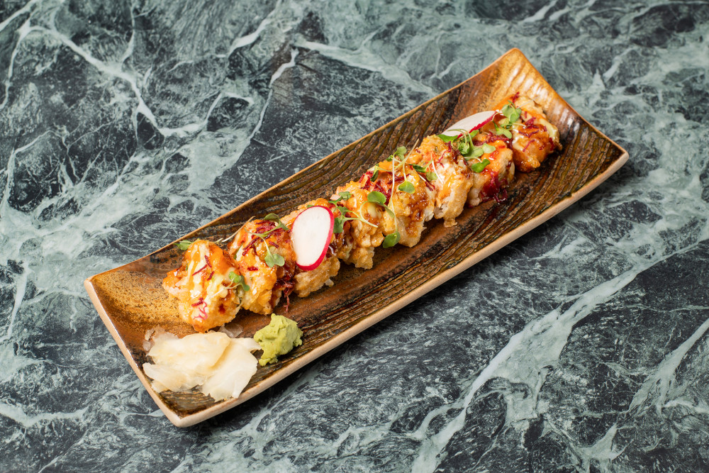 Shrimp Tempura & spicy tuna inside, top with tuna, salmon & avocado, creamy yuzu and spicy momiji
