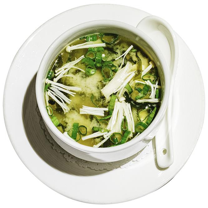 Enoki, silken tofu, seaweed, scallion